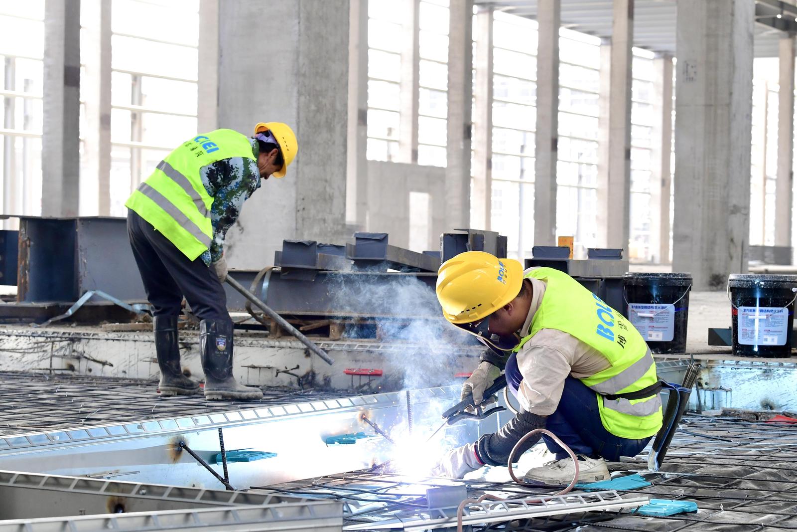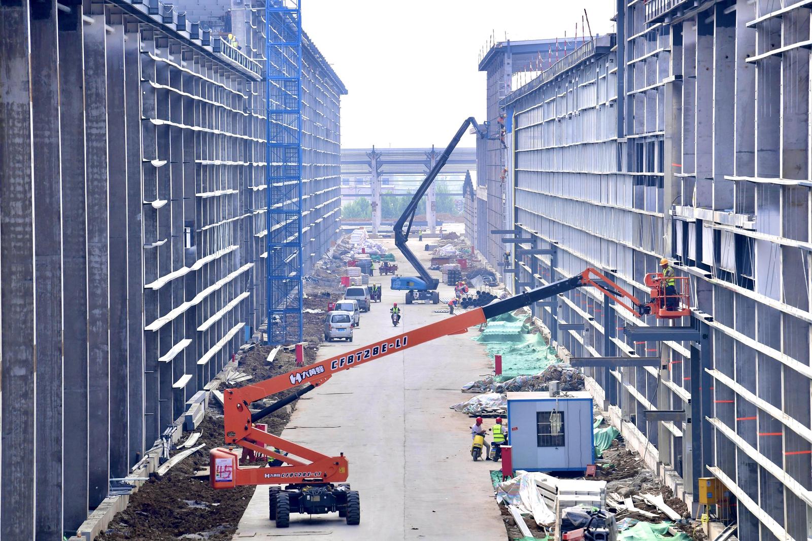 俯瞰1608畝建設(shè)工地,鋼筋骨架撐起的現(xiàn)代化廠房在陽(yáng)光照射下,泛著淡藍(lán)色的光芒。