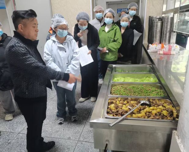 隨后,在工作人員的引導下,家長代表們嚴格按照規范流程,佩戴好一次性口罩、頭套,有序進入食堂后廚核心區域,開啟了“沉浸式”參觀體驗。從食材儲存區、清洗加工間、烹飪操作區,到餐具消毒間、食品留樣柜,家長們沿著“食材驗收—倉儲管理—清洗切配—烹飪加工—餐品留樣—餐具消毒”的完整動線逐一查看,不放過任何一個細節。儲存區里,糧油分類整齊、離地離墻存放,標簽清晰標注著生產日期與保質期;清洗切配區,工作人員嚴格執行生熟分開、色標管理,刀具與砧板分類使用,操作規范有序;烹飪區,廚師們身著統一工裝,在潔凈的灶臺前有條不紊地忙碌,精準把控火候與調味;消毒區,高溫消毒柜持續運轉,消毒后的餐具整齊存入密閉保潔柜;留樣柜中,每一份餐食都按標準留存125克以上,標注清晰的日期與餐次,嚴格執行48小時冷藏留存制度,全方位守護學生飲食安全。