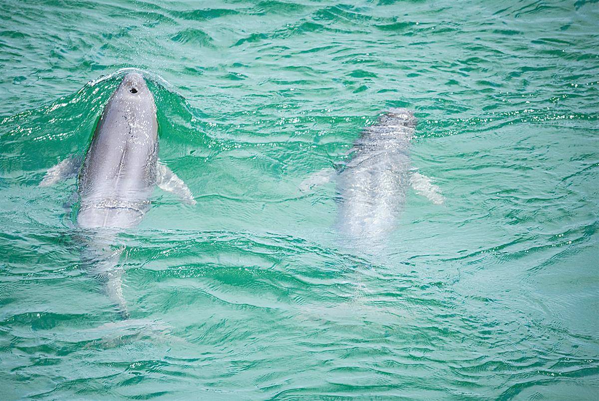長江江豚在碧綠的江水中逐浪嬉戲,翩翩起舞,呈現出一副自然和諧的生態畫面。(視界網 吳承忠 攝)