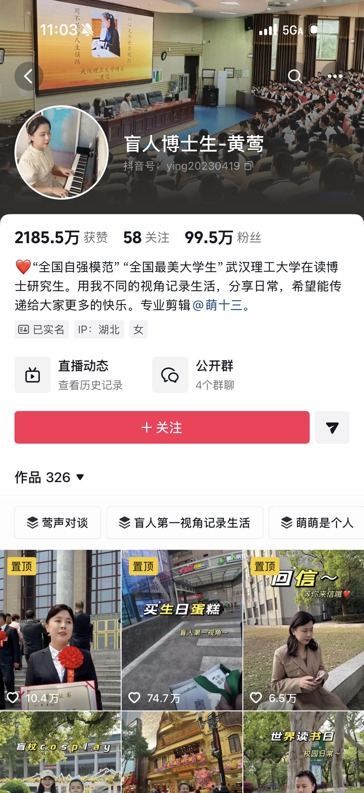 生活中,黃鶯也是個愛美的姑娘。她創(chuàng)辦了“盲著看看”等自媒體賬號,時常分享視障女孩化妝、做飯、超市采購等生活趣事。她的勵志故事、陽光心態(tài)、樂觀灑脫的生活態(tài)度感染眾多網(wǎng)友,每條視頻都有數(shù)萬點贊。